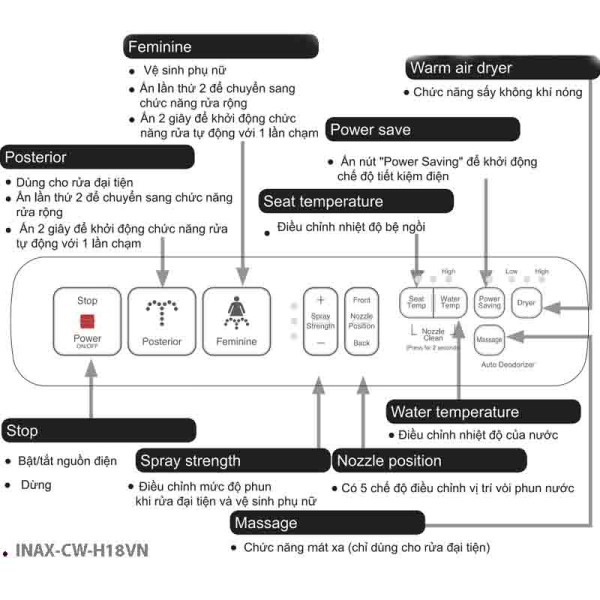 Dòng bồn cầu treo tường AC-952/CW-H18VN sử dụng nắp rửa điện tử của thương hiệu thiết bị vệ sinh Inax với các tính năng hiện đại như sau:
