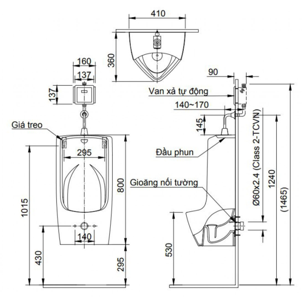 Kích thước tiêu chuẩn 410 × 360 × 800 mm, phù hợp với hầu hết công trình dân dụng và thương mại.