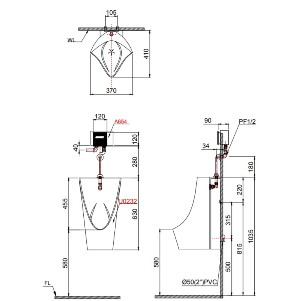 Thông Số Kỹ Thuật Bồn Tiểu Nam CAESAR U0232 Treo Tường