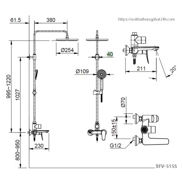 | Kiểu lắp đặt | Sen cây đứng – lắp nổi (thiết kế liền khối) |