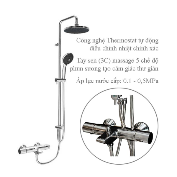 Sản phẩm được trang bị tay sen 3C với 5 chế độ phun khác nhau, giúp người dùng dễ dàng điều chỉnh để có trải nghiệm tắm hoàn hảo. Bạn có thể chọn phun mát-xa thư giãn sau một ngày làm việc căng thẳng, phun sương nhẹ nhàng để tẩy trang, hay phun mưa để có những phút giây thư giãn trong phòng tắm.