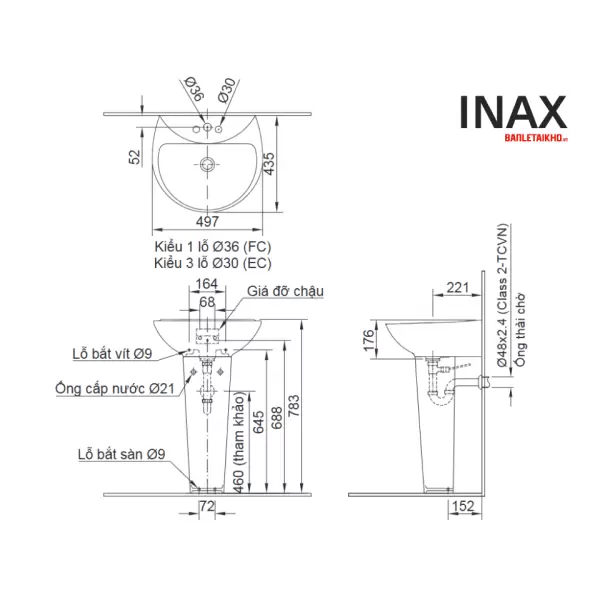 Mã sản phẩm Inax L-285V (chậu) / Inax L-288VD (chân dài) Loại chậu Lavabo treo tường kết hợp chân dài Kích thước chậu ≈ 497 mm (W) × ~435 mm (D) × ~783 mm (H) (tham khảo) :contentReference[oaicite:4]{index=4} Kích thước chân dài ≈ 435 mm (D) × ~783 mm (H) × ~497 mm (W) :contentReference[oaicite:5]{index=5} Chất liệu Sứ vệ sinh cao cấp Màu sắc Trắng sáng Công nghệ men Men sứ sáng bóng, chống bám bẩn (Aqua Ceramic hoặc tương đương) :contentReference[oaicite:6]{index=6} Hãng sản xuất Inax Xuất xứ Việt Nam (theo công nghệ Nhật Bản)