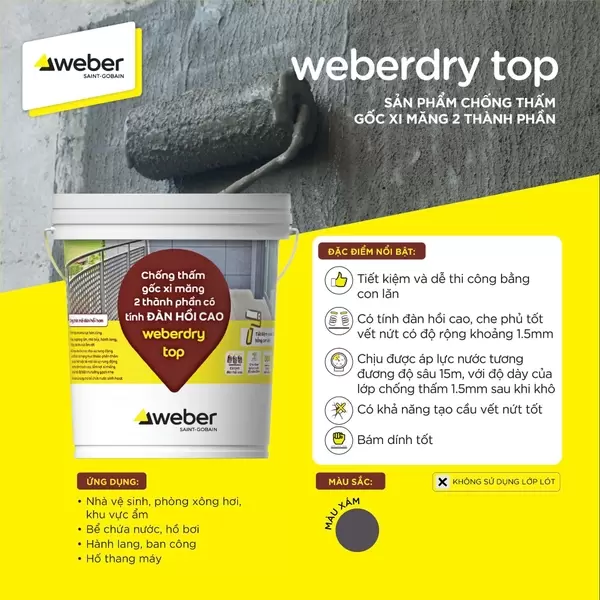 Chống thấm 2 thành phần Weberdry Top 5kg màu xám là dòng sản phẩm cao cấp của thương hiệu Weber (thuộc Saint-Gobain) – được thiết kế đặc biệt để bảo vệ bề mặt bê tông, tường, sàn mái, nhà vệ sinh và hồ nước khỏi tác động của độ ẩm, nấm mốc và thấm nước.