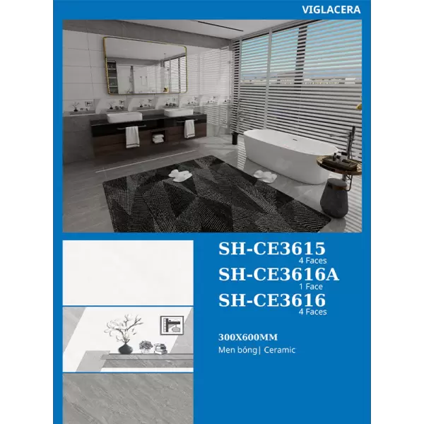Gạch 30x60 viglacera SH-CE3615-16-16A là dòng gạch Ceramic ốp lát mô phỏng vân đá Porcelain cao cấp của thương hiệu Viglacera. Điểm mạnh nhất là bề mặt mài bóng, công nghệ in kỹ thuật số giúp vân đá chân thực, cùng độ bền vượt trội so với gạch men thông thường. Sản phẩm phù hợp cho các chủ đầu tư, kiến trúc sư đang tìm kiếm giải pháp vật liệu chất lượng, giá trị thẩm mỹ cao. Dòng gạch 30x60 viglacera này dùng tốt nhất cho không gian nội thất như phòng tắm, nhà bếp và phòng khách cần sự sang trọng.