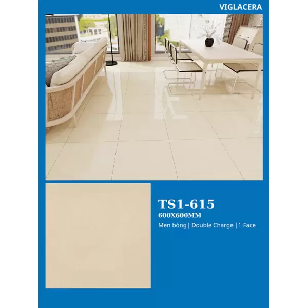 Gạch 60x60 Viglacera TS1-615 là dòng sản phẩm gạch Porcelain cao cấp, kích thước chuẩn 60x60cm, được sản xuất bởi thương hiệu Viglacera danh tiếng. Điểm nổi bật là sản phẩm được ứng dụng công nghệ nén ép Doublecharge tiên tiến của Italia cùng bề mặt men mài bóng tinh tế (Semi Porcelain), mang lại độ bền vượt trội, khả năng chống mài mòn cao và thẩm mỹ sang trọng cho mọi công trình.