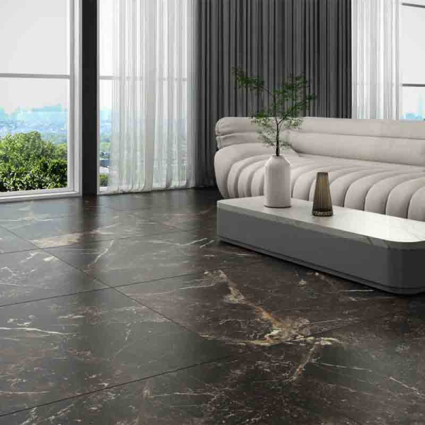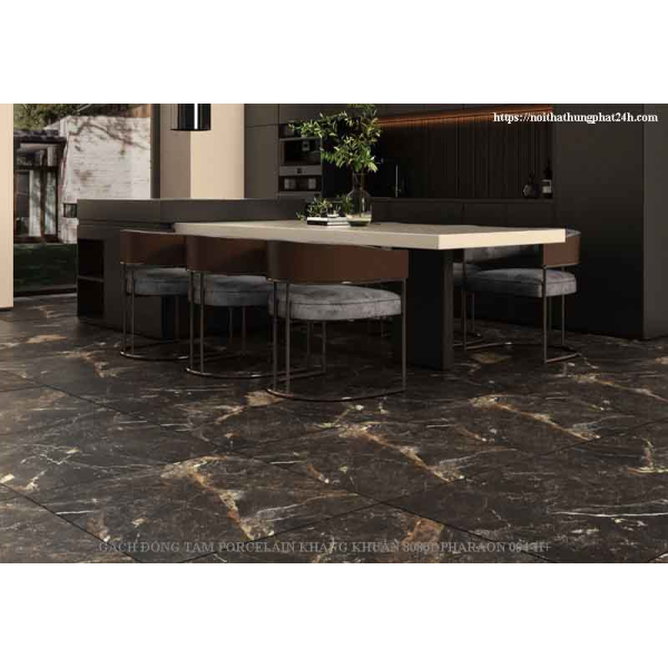 — Gạch Đồng Tâm 80x80 PHARAON004-H+ nổi bật với tông màu đen huyền bí, góp phần tăng chiều sâu và độ tương phản cho không gian nội thất.