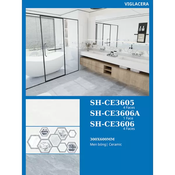 Gạch lát nền viglacera 30x60 SH-CE3605-06-06A là dòng gạch ốp lát Porcelain cao cấp. Điểm mạnh nhất là xương Porcelain đặc chắc, chống thấm tuyệt đối, kết hợp men bóng Polish mang lại vẻ đẹp sang trọng, dễ vệ sinh. Sản phẩm phù hợp cho khách hàng ưu tiên độ bền và tính thẩm mỹ tinh tế. Lý tưởng để sử dụng lát nền khu vực nội thất khô ráo hoặc ốp tường cho các không gian phòng khách, phòng ngủ và nhà tắm.