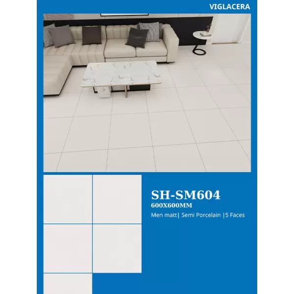 Đây là dòng sản phẩm gạch lát nền cao cấp kích thước 60x60cm thuộc bộ sưu tập nổi bật của thương hiệu Viglacera. SH-SM604 được chế tạo từ chất liệu Semi Porcelain (bán sứ) tiên tiến, nổi tiếng với khả năng chống thấm và độ bền vượt trội. Mẫu gạch này tái hiện hoàn hảo vẻ đẹp tinh tế của vân đá tự nhiên với bề mặt men mờ chống trơn trượt, lý tưởng cho mọi không gian nội thất hiện đại.
