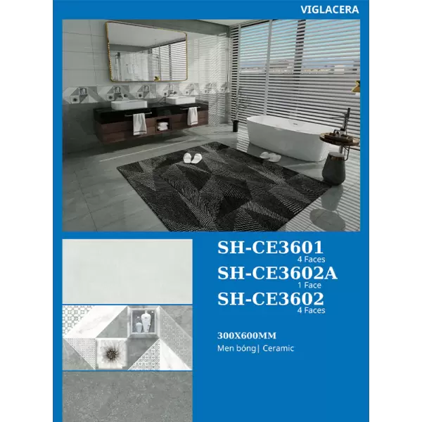 Gạch Viglacera 30x60 SH-CE3601-02-02A là dòng gạch ốp lát Porcelain, men bóng kích thước 30x60cm, nổi bật với khả năng chống thấm tuyệt đối và độ bền vượt trội. Sản phẩm lý tưởng cho các gia chủ, kiến trúc sư đang tìm kiếm vật liệu cao cấp, hiện đại với chi phí tối ưu. Nó được ứng dụng tốt nhất trong các không gian nội thất như phòng khách, phòng ngủ (lát nền) hoặc nhà tắm, hành lang (ốp tường).