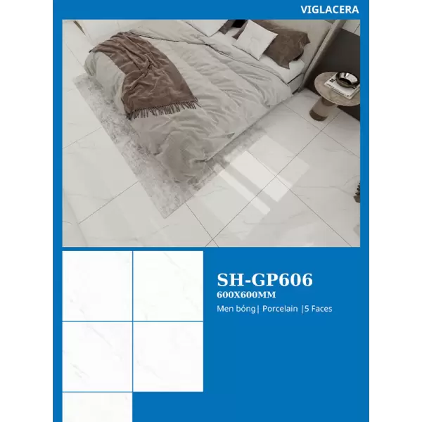 Gạch Viglacera 60x60 SH-GP606 ứng dụng công nghệ in kỹ thuật số tiên tiến giúp tái tạo họa tiết vân đá một cách chân thực và sắc nét, đồng thời bề mặt men bóng càng làm tăng thêm vẻ lộng lẫy và dễ dàng vệ sinh, duy trì độ mới dài lâu cho công trình của bạn. Đừng chần chừ, hãy cùng Nội Thất Hưng Phát tìm hiểu ngay các chi tiết kỹ thuật vượt trội của sản phẩm này!