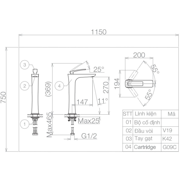 Thông số kỹ thuật Vòi lavabo nóng lạnh cổ cao Viglacera VG142.1 |