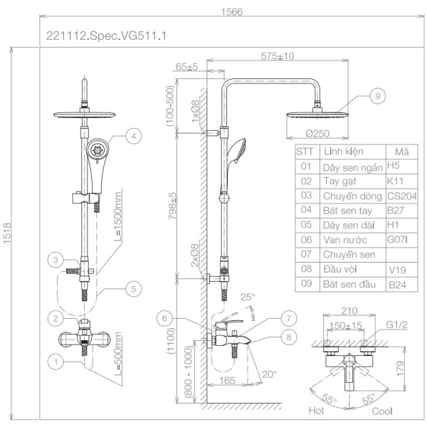 | Thông số kỹ thuật Vòi sen tắm nóng lạnh Viglacera VG511 | |